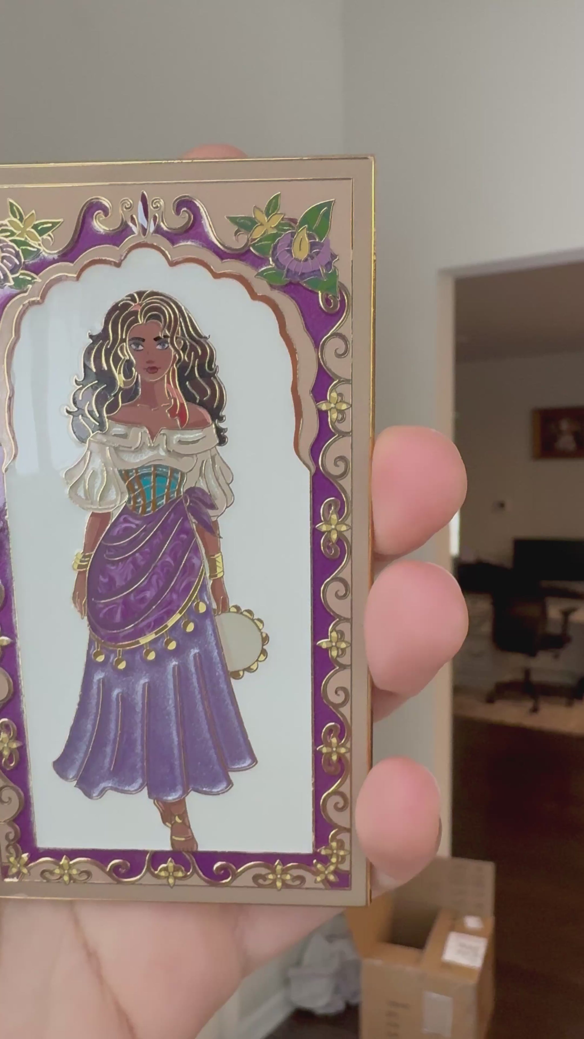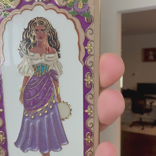 Gold metal, 4" hard enamel pin with gold plating, gold metal frame, screen printing, sandblast, pearl no swirl, and a custom backstamp.